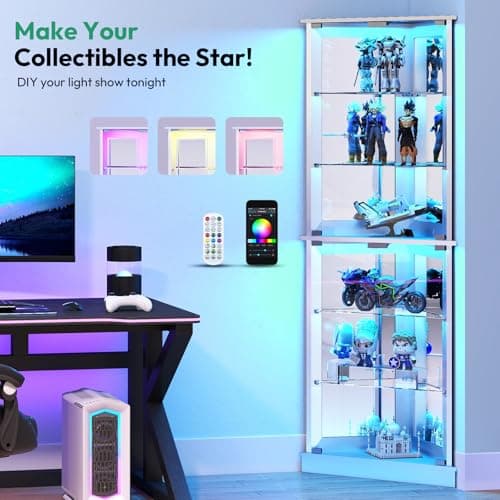 BROTTAR Corner Display Cabinet with Doors, 4-Tier Curio Cabinet for Collectibles, Display Case with 3 Color Light, Storage Cabinets with Door, Bookcase with Human Body Sensor, Black (15.7" W)