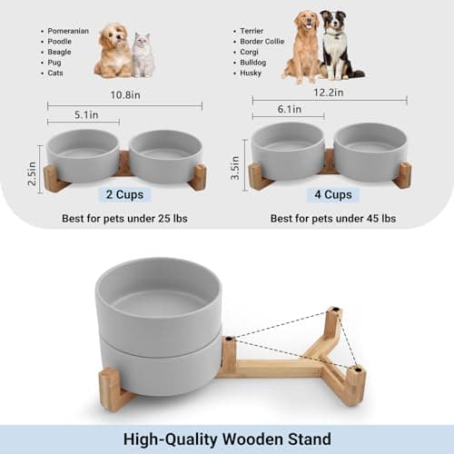 MALACASA Dog Bowl Set with Walnut Wood Stand, 1.5 Cups Ceramic Pet Bowls for Puppy Dogs, Dual Food and Water Bowls with Weighted Non-Slip Base, Basic Bowls for Your Dog or Cat, Rhombic & Polka Dots