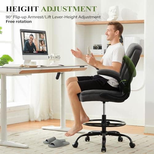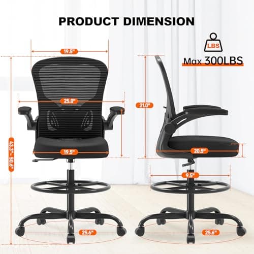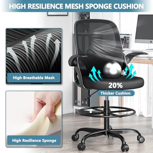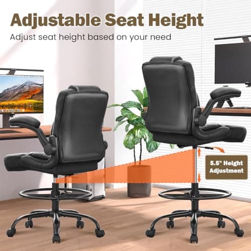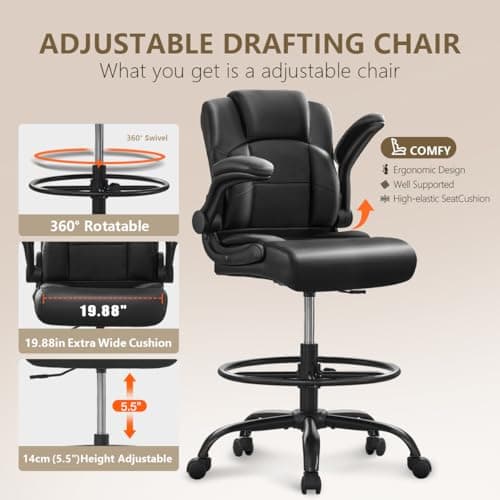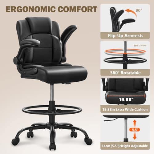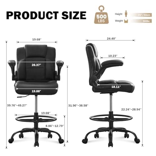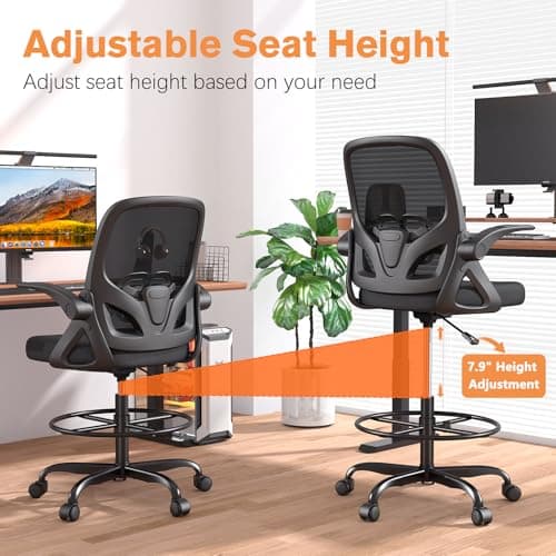 Primy Drafting Chair Tall Office Chair with Flip-up Armrests Executive Ergonomic Computer Standing Desk Chair with Lumbar Support and Adjustable Footrest Ring (Black)