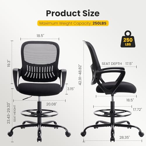 BestOffice Drafting Chair Tall Office Chair Adjustable Swivel Rolling Mesh Height with Lumbar Support Arms Footrest Mid Back for Adults Standing Desk Drafting Stool(Black)
