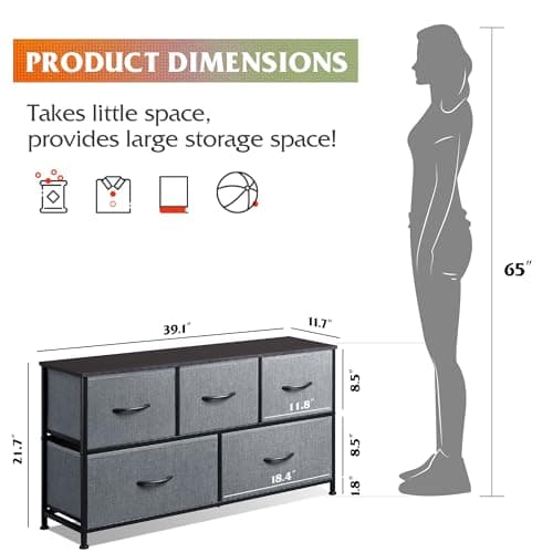 AZL1 Life Concept Extra Wide Dresser Storage Tower with Sturdy Steel Frame, 5 Drawers of Easy-Pull Fabric Bins, Organizer Unit for Bedroom, Hallway, Entryway, 11.4"D x 39.4"W x 21.6"H, Dark Grey
