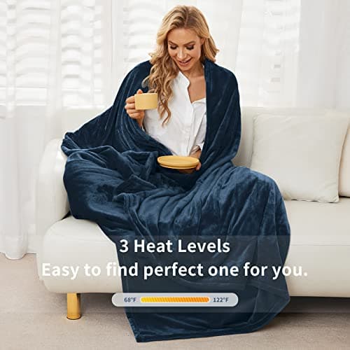 Thermee Micro Flannel Heated Blanket Queen Size - 10 Settings, Programmable, Rapid Heating, Luxuriously Soft - English Blue