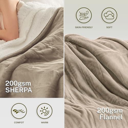 Cozorbt Heat Blanket 50”x60” Throw,Soft Flannel & Sherpa Reversible Electric Blanket with 10 Heat Settings,12 Timer Setting and 3 Hours Auto-Shut Off,ETL Certified Machine Washable,Light Brown
