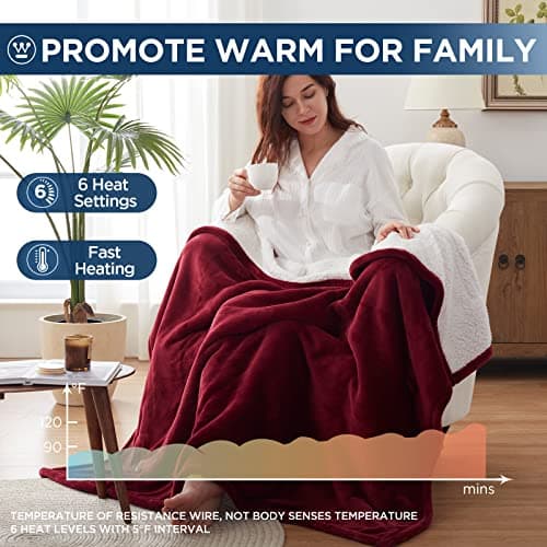 Sunbeam Electric Throw Royal Mink Sherpa Heated Blanket, 4 Heat Settings, 4-Hour Auto Shut-Off, Fast Heating, Luxurious and Ultra Comfy, Cabernet Color, 50" x 60"