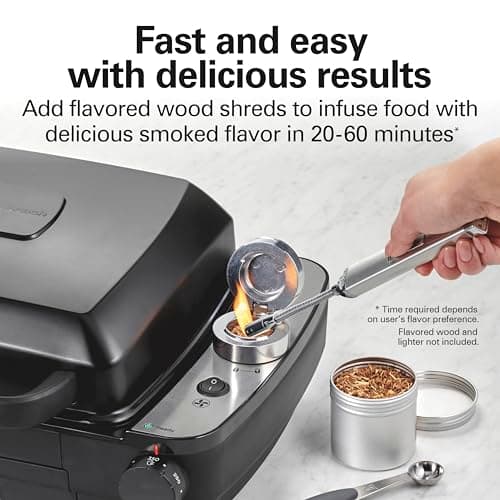 Hamilton Beach Electric Indoor Grill with Hot and Cold Smoke Infuser, 150°F - 450°F Temperature Control For Searing, Vented Hood and Fan, 116 Sq. In. Non-Stick Cooking Surface, Black (25375)