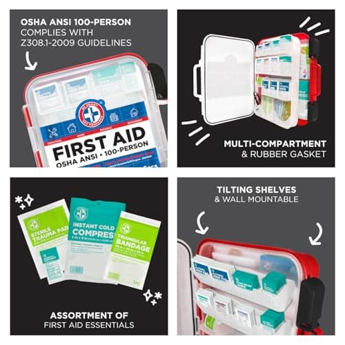 Be Smart Get Prepared First Aid Kit Hard Red Case 326 Pieces Exceeds OSHA and ANSI Guidelines 100 People - Office, Home, Car, School, Emergency, Survival, Camping, Hunting and Sports (20HBC01015REV3)