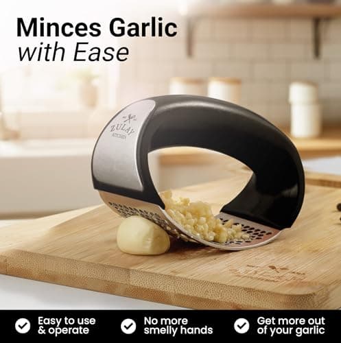 Zulay Kitchen Premium Garlic Press Set - Rust Proof Professional Garlic Mincer Tool - Easy-Squeeze, Easy-Clean with Soft, Ergonomic Handle - Silicone Garlic Peeler & Brush (Silver)