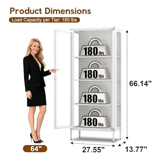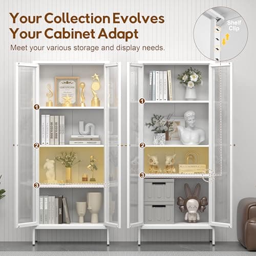 UNICOLY Display Cabinet with Glass Doors, Glass Display Cabinet 4-Tier, Metal Curio Display Cabinet with Tempered Glass Doors for Living Room, Plant, Display Shelf, Assembly Required, White
