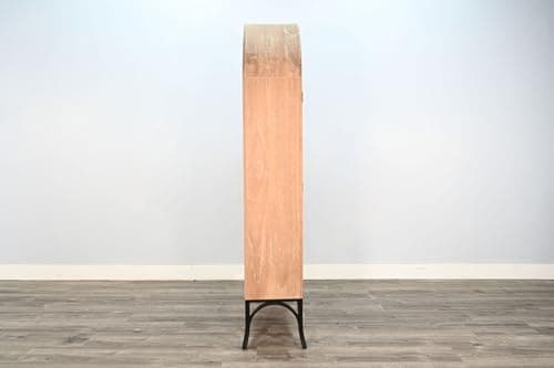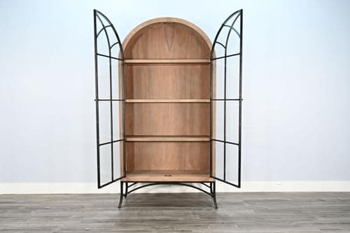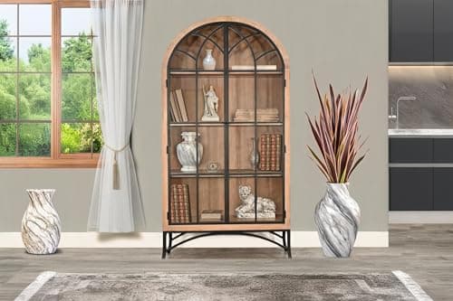 Sunny Designs Ella Arched Metal & Wood Display Cabinet with Glass Doors – Powder-Coated Steel Frame, Magnetic Latches, Adjustable Shelves, Windowpane Design, Living Room Storage (Oak Grove)