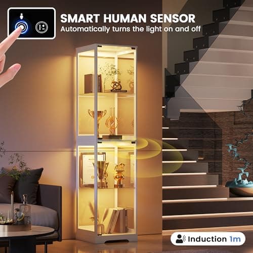 BROTTAR Glass Display Cabinet, 4-Tier Curio Cabinets with 3 Color Lights for Collectibles, Storage Cabinet with Door, Glass Display Case & Bookcase with Human Body Sensor, Black