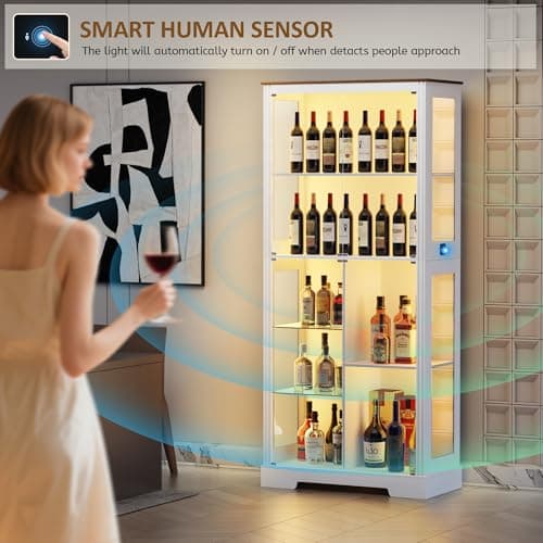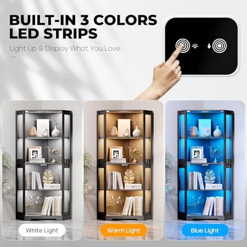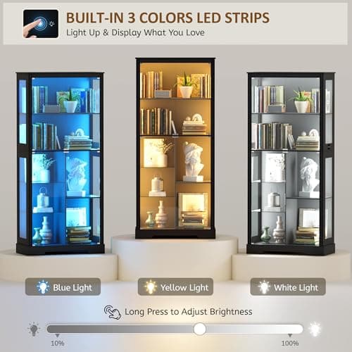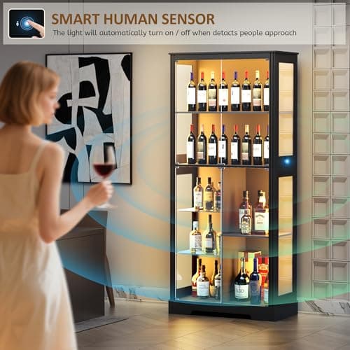 BROTTAR Glass Display Cabinet, 4-Tier Curio Cabinets with 3 Color Lights for Collectibles, Storage Cabinet with Door, Glass Display Case & Bookcase with Human Body Sensor, Black
