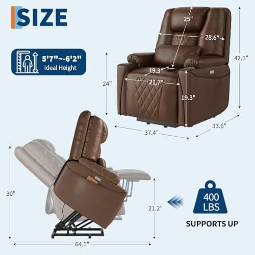 Phoenix Home Large Power Lift Recliner Chairs with Massage and Heat for Elderly, Heavy Duty Electric Faux Leather Reclining Chairs with USB Port and 2 Side Pockets, Brown