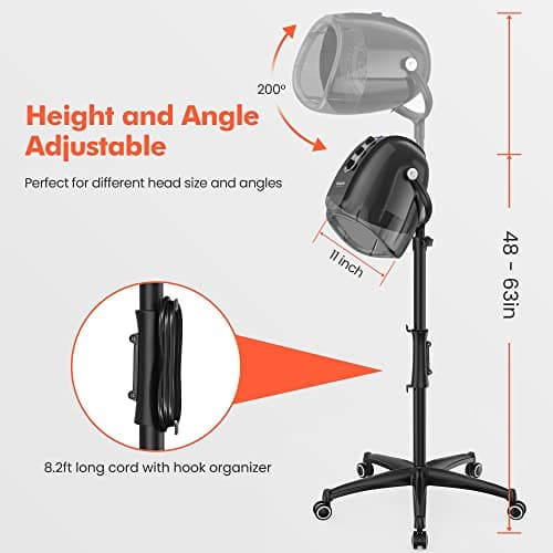 COLLIFORD Ionic Hooded Hair Dryer, 1875W Professional Height Adjustable Standing Hair Dryer Bonnet with 3 Temperature Settings, Portable Salon Dryer with Rolling Wheels for Home & Hairstylist