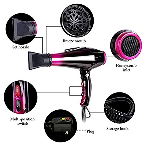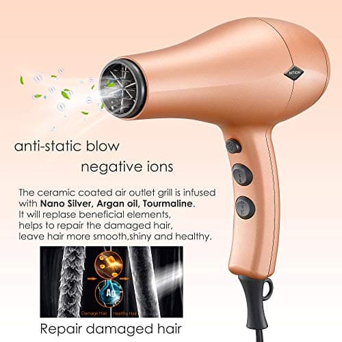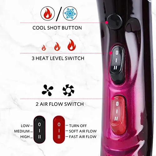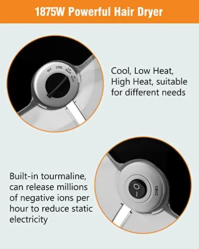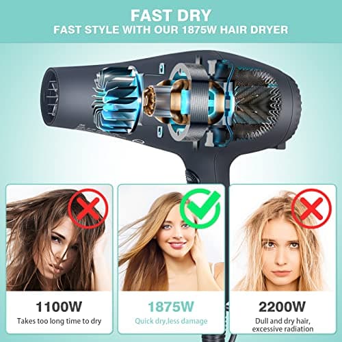 Hair Dryer 1875W, Negative Ionic Fast Dry Low Noise Blow Dryer, Professional Salon Hair Dryers with Diffuser, Concentrator, Styling Pik, 2 Speed and 3 Heat Settings