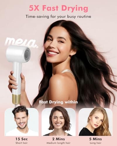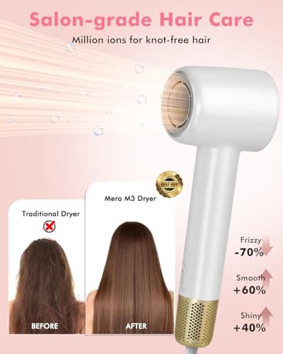 Ionic Hair Dryer - Mera M3, Professional Frizz-Fighting Blow Dryer, 5-Minute Fast Drying, Quiet Lightweight Travel Hairdryer with Snap-On Concentrator for Women