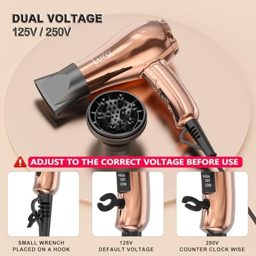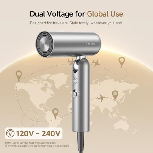 Dual Voltage Travel Hair Dryer with Diffuser, High-Speed Ionic Blow Dryer for Women, Fast Drying, Low Noise, Lightweight, No Heat Damage, European Travel 110V-120V/220V-240V