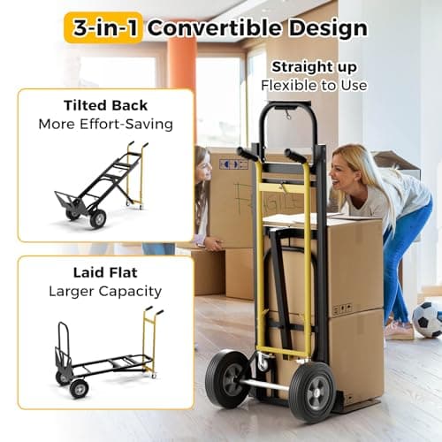 Simpli-Magic 800 lb Capacity 2 in 1 Convertible Hand Truck and Dolly with 10" Flat-Free Solid Rubber Wheels,Black with Yellow Handle.