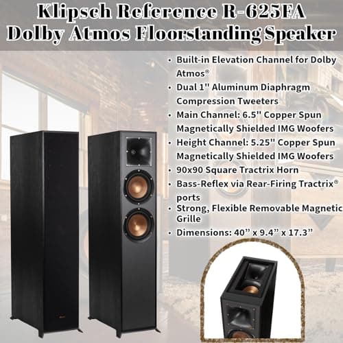Klipsch Reference 5.1 Dolby Atmos Home Theater System with R-625FA Floorstanding Speakers, R-52C Center, R-41M Surrounds & R-12SW 12" Powered Subwoofer, Black (Speaker System + Subwoofer)