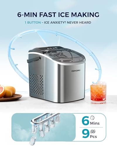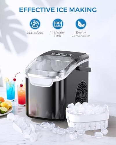 ecozy Portable Ice Maker Countertop, 9 Cubes Ready in 6 Mins, 26 lbs in 24 Hours, Self-Cleaning Ice Maker Machine with Bags/Standing Scoop for Camping Party, Black