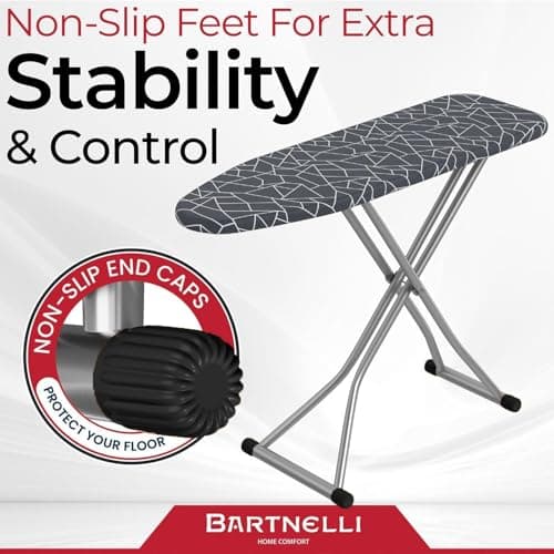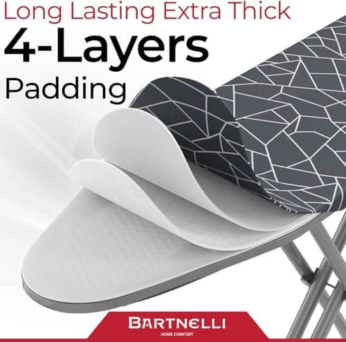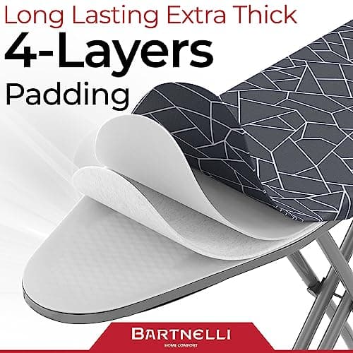Bartnelli by Rorets Ironing Board Made in Europe | Iron Board with 4 Layered Cover & Pad, Height Adjustable up to 36" Features A Safety Iron Rest, 4 Steel Legs, for Laundry Room or Dorm Use (43x13)