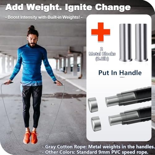 BURNCALO Weighted Jump Rope for Fitness, Skipping Rope for Men Women, Metal Heavy Handles, Ball bearings, Adjustable Length PVC Cord and Cotton Rope, Endurance Training Fitness Exercise Workout