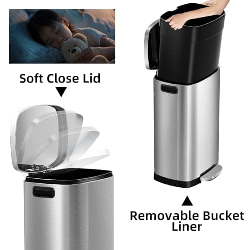 Amazon Basics Smudge Resistant Rectangular Trash Can with Soft-Close Lid, Foot Pedal, Removable Inner Bucket, 5L/1.32 Gal, Brushed Stainless Steel, for Bathroom & Small Space, Satin Nickel Finish