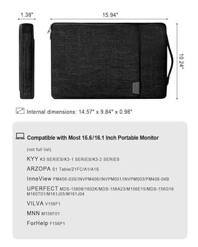 15.6-16.1 Inch Portable Monitor Sleeve Case for CAPERAVE KYY MNN VILVA InnoView ZSCMALLS QQH FANGOR HONGO CNBANAN ViewSonic, ASUS ZenScreen ACER Laptop External Display Travel Carrying Bag