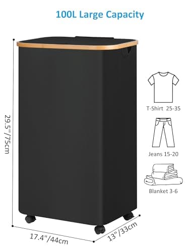 efluky Laundry Basket with Wheels, Aesthetic Dirty Clothes Basket on Wheels for Laundry Room, Bedroom, Dorm and Bathroom, 100L Black