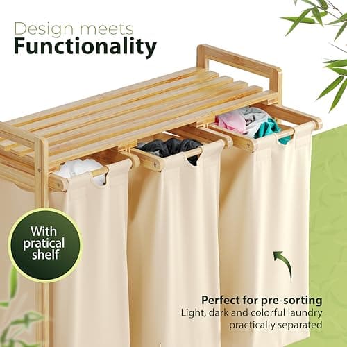 AMBIAVO Laundry Hamper 3 Section beige - Large Bamboo Laundry Sorter with Removable Cotton Bags -Three Compartment Organizer for Clothes - Durable, Eco-Friendly, and Stylish Storage Solution for Home