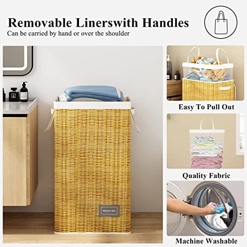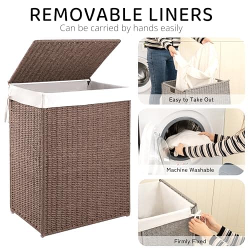 OIAHOMY Laundry Hamper with Lid, 23.8 Gal (90L) Wicker Hamper with Removable Liner Bags, Handwoven Clothes Basket with Handles, Foldable Woven Paper Rope Basket for Laundry Room, Bedroom-Brown