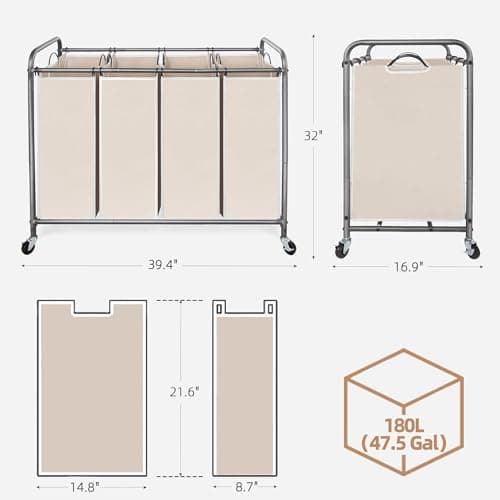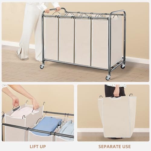 STORAGE MANIAC Laundry Sorter 4 Section, 47.8 Gal (181 L) Laundry Hamper with Wheels, Clothes Divider Basket Sorter, Clothes Separator Hamper Cart with Wheels and Removable Bags, Beige
