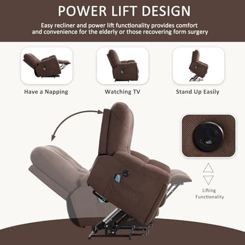 MCombo Electric Power Lift Recliner Chair Sofa with Massage and Heat for Elderly, 3 Positions, 2 Side Pockets, and Cup Holders, USB Ports, Faux Leather 7040 (Light Brown, Medium)