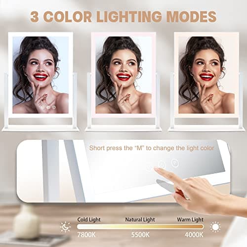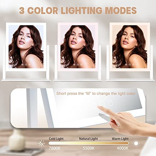 Hasipu Vanity Mirror with Lights, 24.2" x 19.7" LED Makeup Mirror, Light up Mirror with 10X Magnification and USB, Phone Holder, Smart Touch 3 Colors Dimmable, 360° Rotation (Right Angle White)