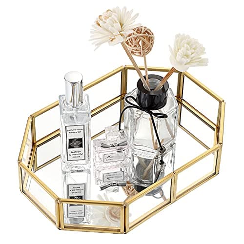 Hipiwe Mirror Glass Vanity Tray - Gold Ornate Makeup Tray Vintage Octagonal Perfume Tray Dresser Trays Jewelry Trinket Organizer for Bathroom Storage Trays for Home Decor