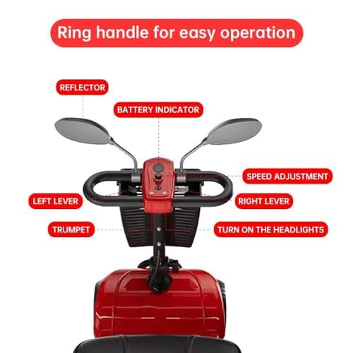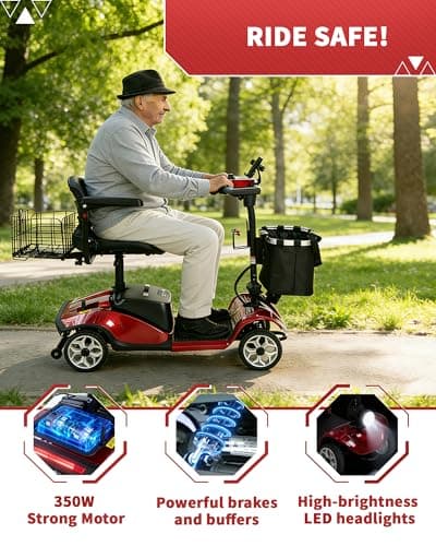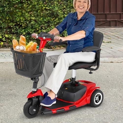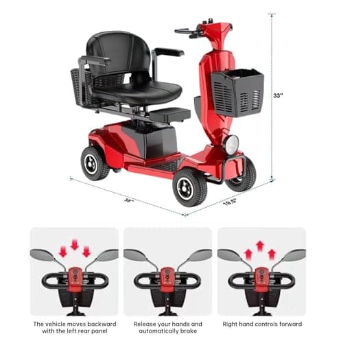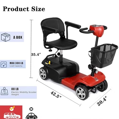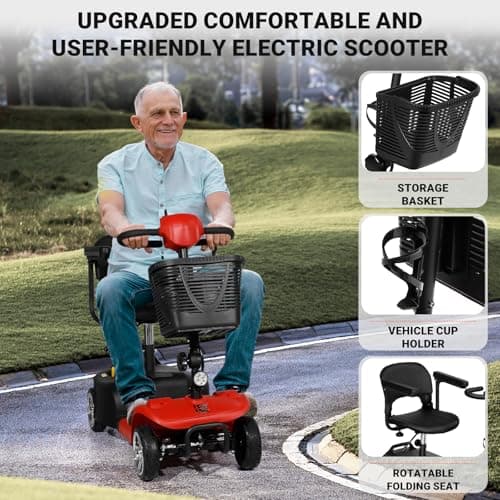 FWFFWF Mobility Scooter, 4 Wheels Rechargeable Electric Scooter for Adults and Seniors W/Lights,Removable Basket, Rotating Seat and Cup Holder, Red