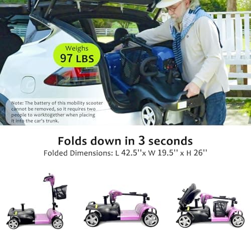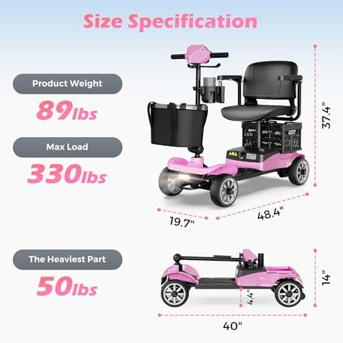 4-Wheel Mobility Scooter for Adults – Foldable Portable Motorized Scooters with 330lbs Capacity, Detachable Battery, Dual Baskets, Cup & Phone Holder, Pink