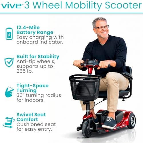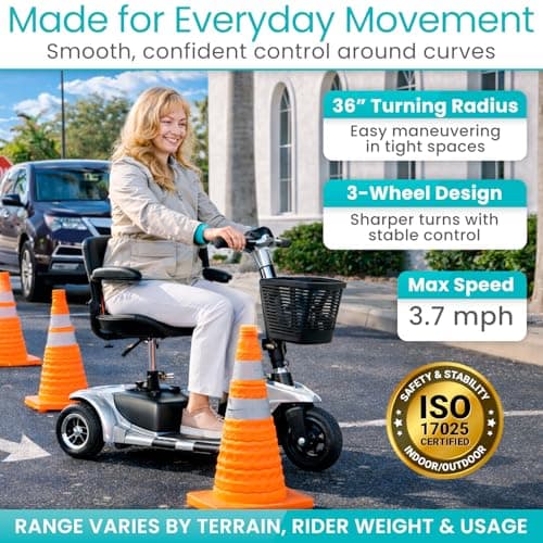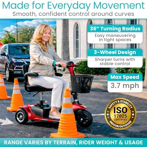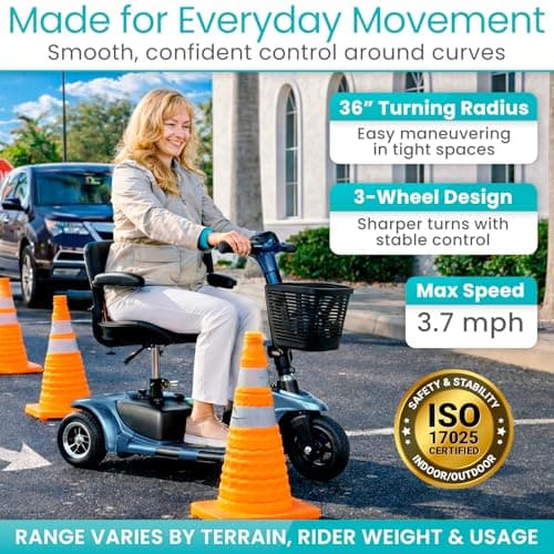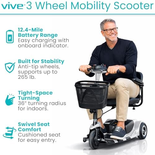 Vive 3 Wheel Mobility Scooter - Electric Powered Mobile Wheelchair Device for Adults - Folding, Collapsible and Compact for Travel - Long Range Power Extended Battery with Charger and Basket Included