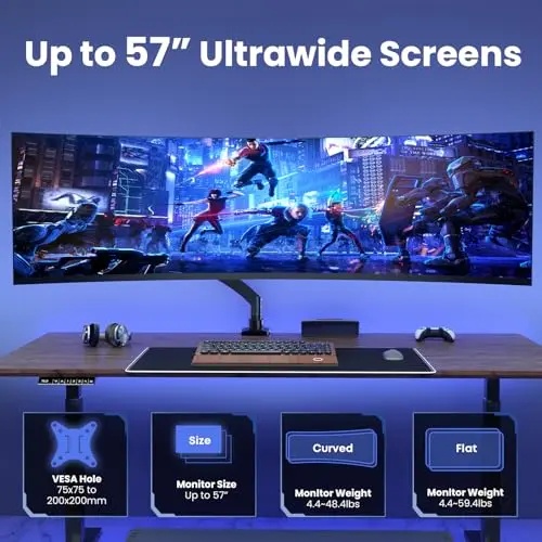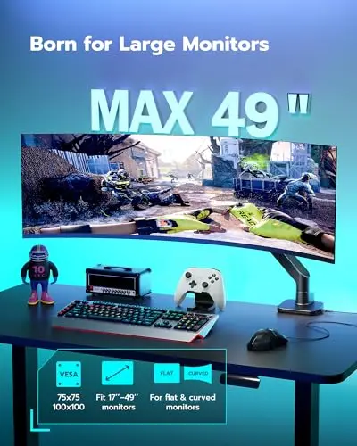 Compared with size-driven pages such as 34-inch ultrawide or 57-inch ultrawide, this route is organized around the overall desk scenario rather than panel dimensions alone. It also overlaps with full-motion picks, but gaming setups care just as much about stable placement and clean desk space as pure articulation.