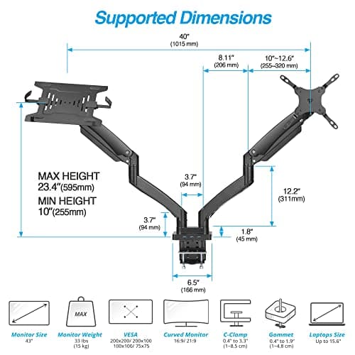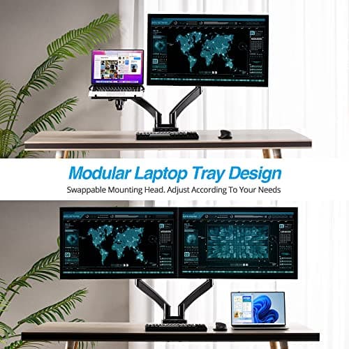 Mount-It! Monitor and Laptop Desk Mount, Height Adjustable Dual Arm Stand with Vented Laptop Tray, Fits Laptops up to 17 Inch and 13–27 Inch Monitors, VESA 75x75 & 100x100, Clamp or Grommet Mount