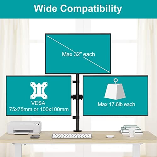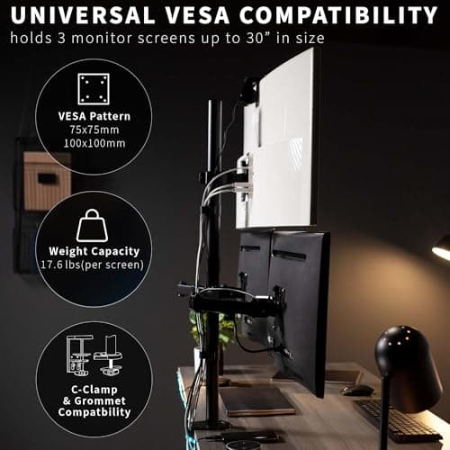 MOUNT PRO Triple Monitor Mount, Monitor Desk Mount for 3 Screens up to 32 inch, 17.6 lbs Each, Fully Adjustable Stacked Computer Stand, Table VESA Mounting, C clamp/Grommet Base