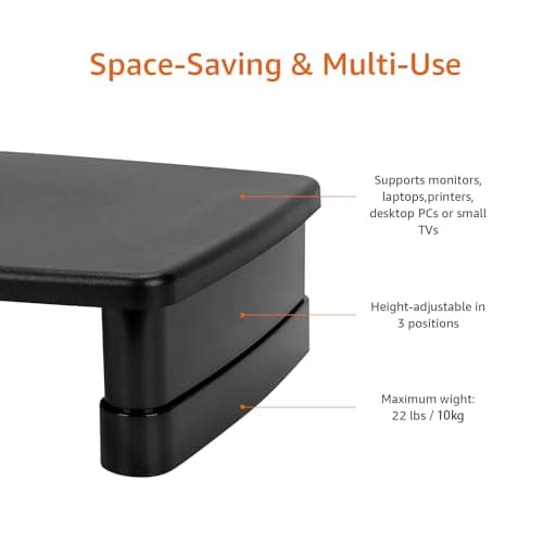 Amazon Basics Height Adjustable Monitor Stand Riser with Storage Organizer, Multifunctional Desk Accessories for Reduced Neck Strain - Fits Monitors, Laptops Up to 22lbs, Black