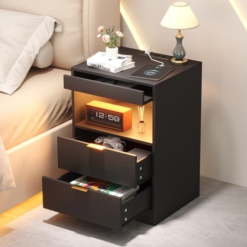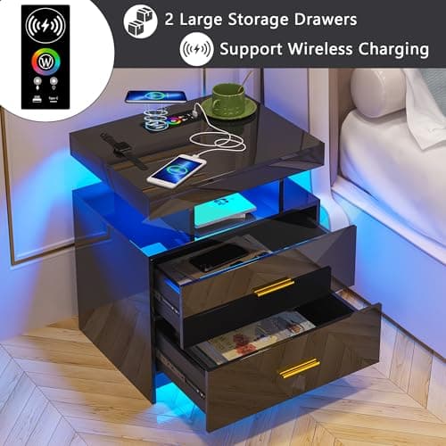 HNEBC Auto LED Nightstand with Wireless Charging Station & USB Ports,High Gloss Bedside Tables with 2 Drawers,Floating Nightstand with 3 Color & Adjustable Brightness for Bedroom,Black