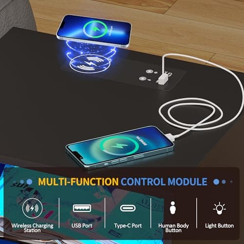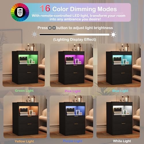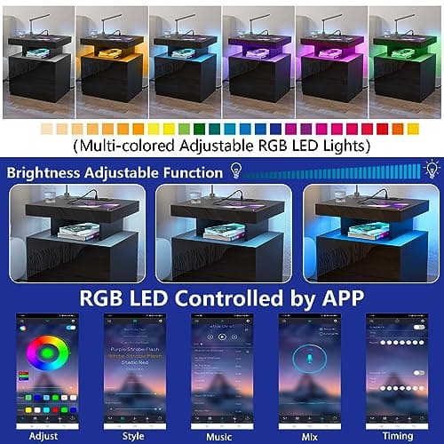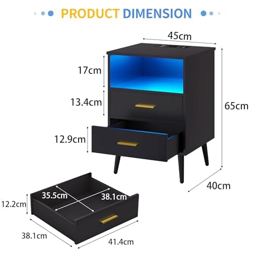 ADORNEVE LED Nightstand Black Nightstand with Wireless Charging Station 2 Drawers, Modern Bedroom End Side Table with LED Lights, Wooden Sofa Bedside Table with Pull-Out Shelf