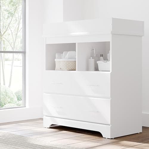 Storkcraft Brookside 2 Drawer Changing Table Dresser (White) – GREENGUARD Gold Certified Baby Dresser with Changing Table Top, Baby Changing Table Dresser, Includes Interlocking Drawer System