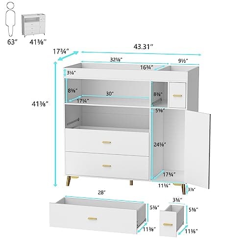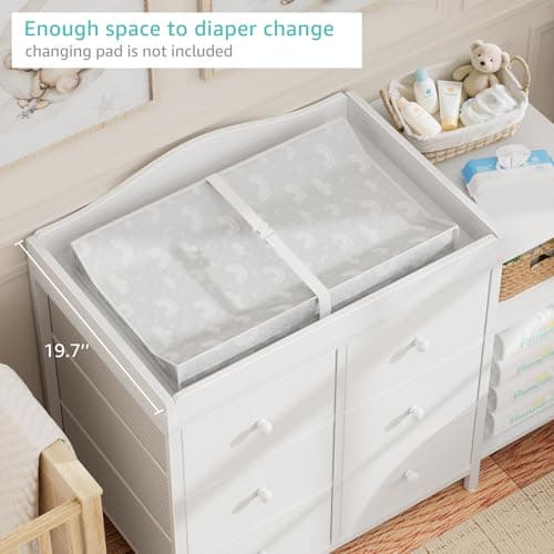 BOLUO Baby Dresser with Changing Table Top, White Changing Table Dresser with 6 Fabric Drawers Diaper Changing Station with Storage Shelf for Nursery Modern