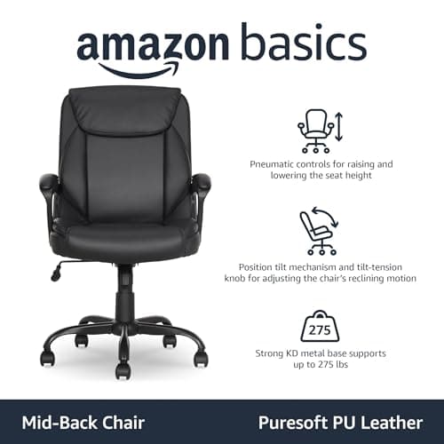 Amazon Basics Classic Puresoft PU Padded Mid-Back Office Desk Chair with Armrest, Easy Assembly, Sturdy Metal Base, Wheels, 275lb Support, 26"D x 23.75"W x 42"H, Black