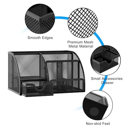 EasyPAG Mesh Desk Organizer with Drawer Multi-functional Pen Holder Stationery Organizer for Office School Supplies 6 Compartments Dorm Organizers and Storage for Desk, Black