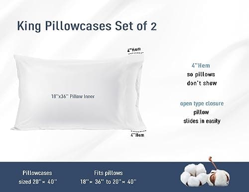 Sunflower Pillow Cases King Set of 2, 100% Cotton King Pillowcases, 20×40 inches with Silver Trim, Soft and Breathable, White