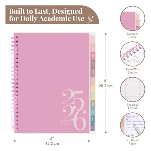 Rileys Academic Planner 2025-2026, Daily, Weekly & Monthly Planner, July 2025 - June 2026, Student Notes Pages, Twin-Wire Binding, Weekly Agenda for School & Work (8 x 6-Inches, Pink, Classic)