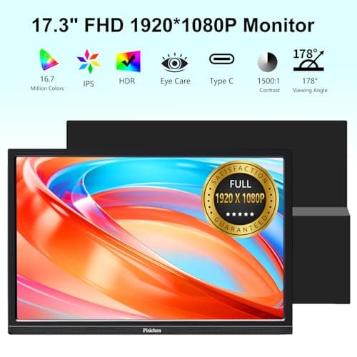 Pisichen Portable Monitor 17.3 Full HD 1920x1080P Large Computer Display IPS Screen HDMI USB TypeC External Travel Monitor for Laptop PC Xbox Switch Ras Pi, Built-in Speakers & Kickstand